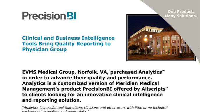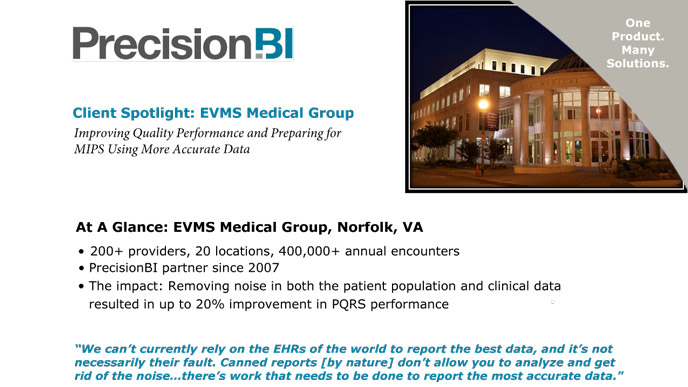 Many clients use PrecisionBI (PBI) for revenue cycle analysis. However, EVMS Medical Group’s focus for PBI centers around managing and improving patient health with clinical data. This includes pre-visit preparation, coding/ documentation consulting, clinical task management, and patient education.