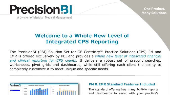 The PrecisionBI (PBI) Solution Set for GE Centricity™ Practice Solutions (CPS) PM and EMR is offered exclusively by PBI and provides a whole new level of integrated financial and clinical reporting for CPS clients.